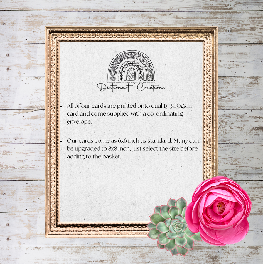 Printed on to a 6x6 or 8x8 inch greeting card.